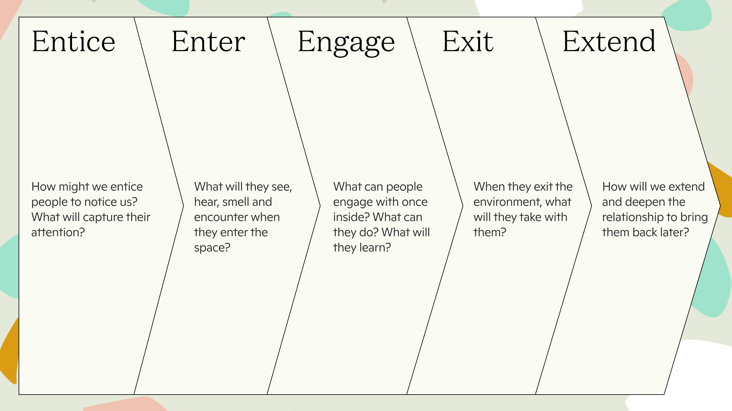 The 5Es are Entice, Enter, Engage, Exit, and Extend. For each, we gave ourselves five minutes to respond to a guiding prompt, with the specific physical environment in mind.